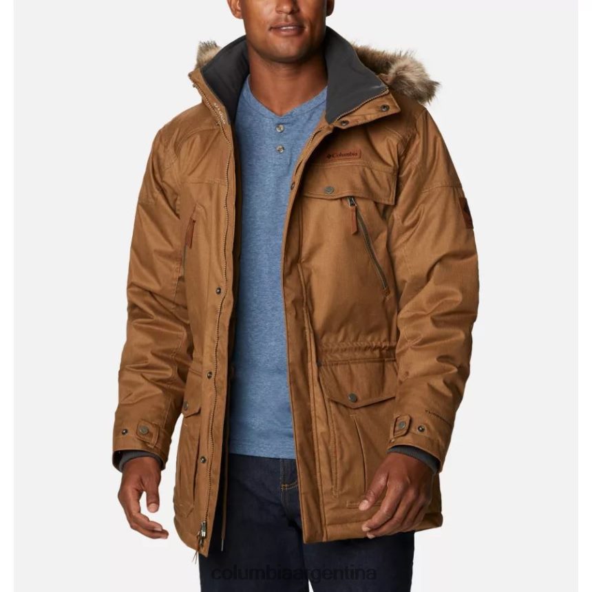 las características adicionales incluyen una capucha ajustable con ribete de piel sintética extraíble, bolsillos en el pecho y los costados, y cintura y puños ajustables para mayor comodidad.