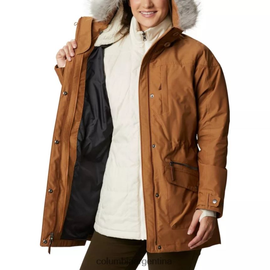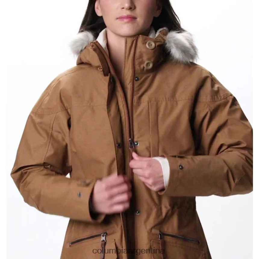 la capa exterior cuenta con una capucha ajustable con forro polar con ribete de piel sintética extraíble, cintura con cordón y chaqueta más larga. dobladillo trasero.