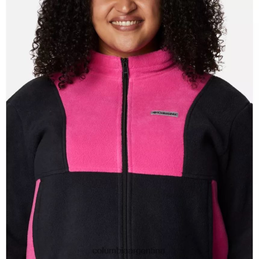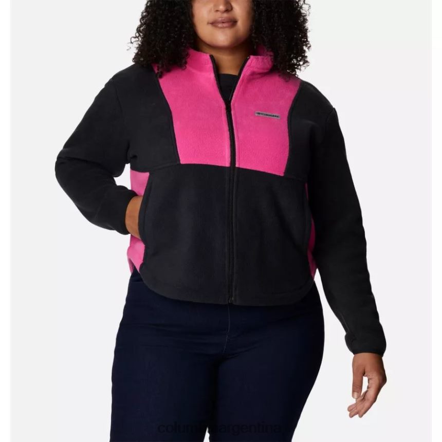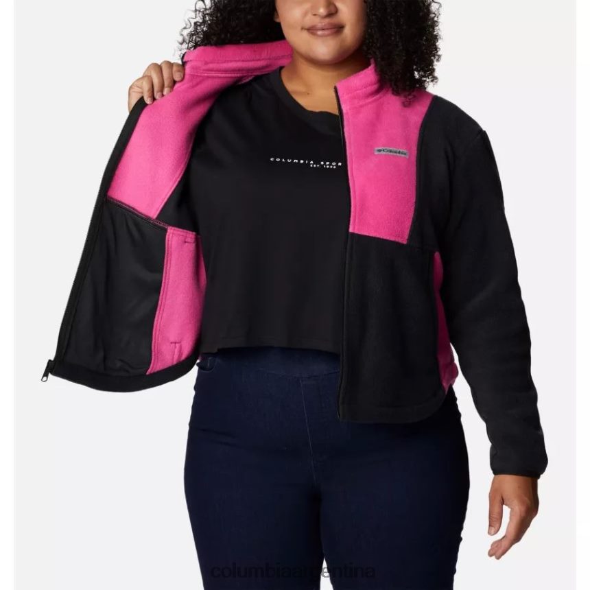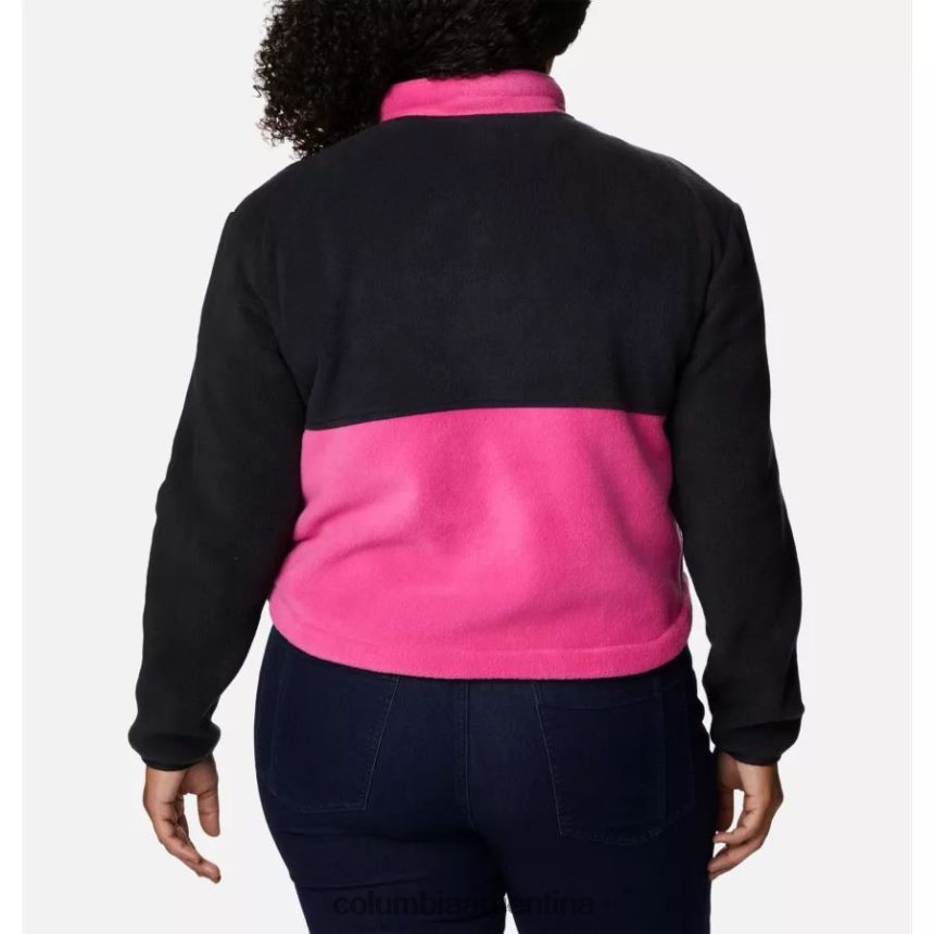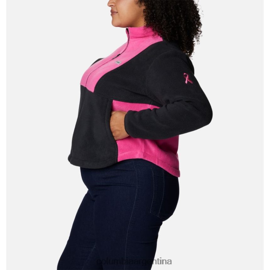 esta chaqueta de polar gruesa y ligeramente recortada presenta bloques de colores llamativos en un esquema de colores de concientización sobre el cáncer de mama.